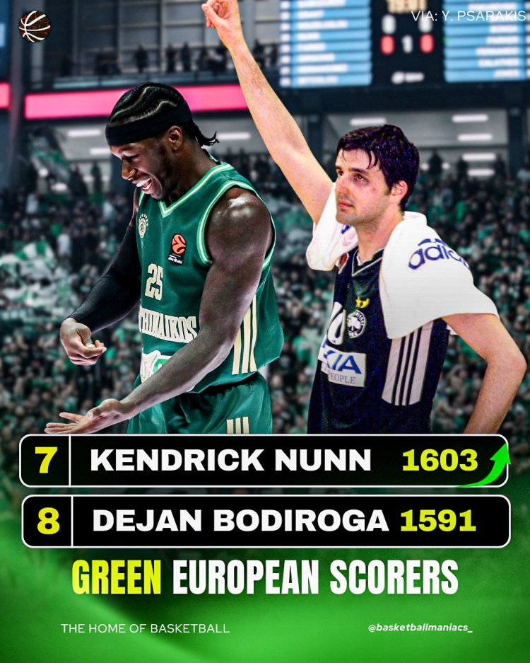 这样一来,纳恩欧篮联生涯总得分来到了1603分,超越了博迪洛加来到了队史欧篮联得分榜第7位。